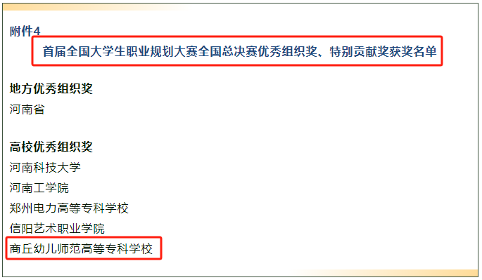 学校高度重视此次赛事组织工作,于2023年9月启动校内选拔,我校共有近600同学报名参加了校赛,在首届全国大学生职业规划大赛中,经过河南省组委会层层选拔,择优推荐,商丘幼儿师范高等专科学校获得了全国高校优秀组织奖。